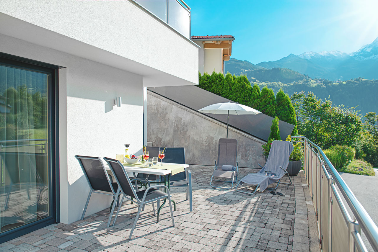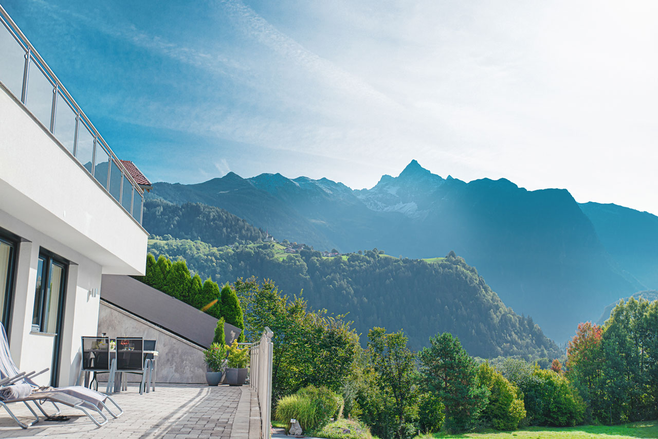 Auf der großen Sonnenterrasse, mit dem Blick auf die traumhafte Landschaft ringsum, können Sie Ihre Seele so richtig baumeln lassen.